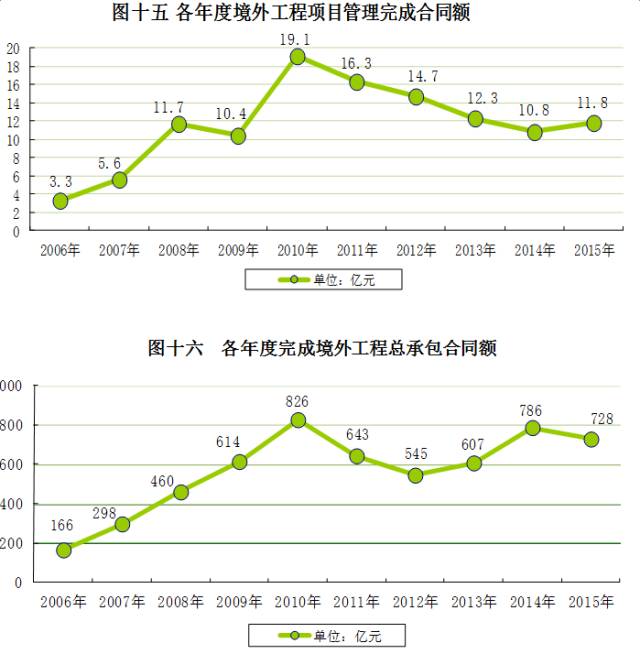 境外工程项目管理和工程总承包完成合同额完成情况变化起伏较大,2010年发展到顶峰以后出现不同程度下降。这与当时全球经济环境不景气有关。