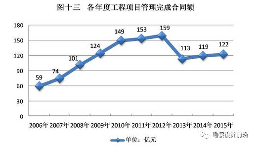 2012年以前工程项目管理完成合同额逐年提高,2012年大幅下滑,目前仍在复苏之中