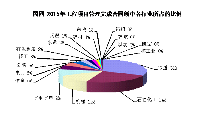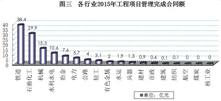 2015年各行业工程项目管理业绩:铁道行业完成合同额38亿,占比最高