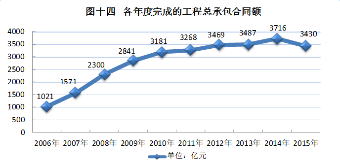 工程总承包完成合同额逐年上升,近几年增长速度有所放缓,2015年也出现了下降。